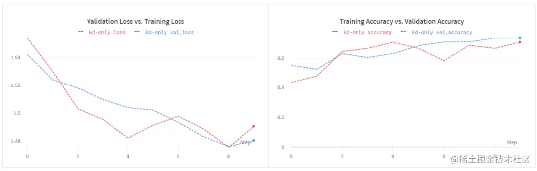 如果你已经熟悉了如何在TensorFlow 2中定制一个训练循环,那么train_step()函数应该是一个容易阅读的函数。注意get_kd_loss() 函数。这可以是我们之前讨论过的任何损失函数。我们在这里使用的是一个训练过的教师模型,这个模型我们在前面进行了微调。通过这个训练循环,我们可以创建一个可以通过.fit()调用进行训练完整模型。
