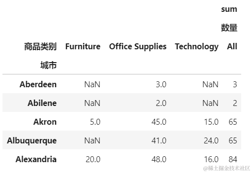 result4 = pd.pivot_table(data,index=['城市'],columns=['商品类别'],aggfunc=[np.sum],values=['数量'],margins=True)