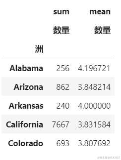 result3 = pd.pivot_table(data,index=['洲'],aggfunc=[np.sum,np.mean],values=['数量'])