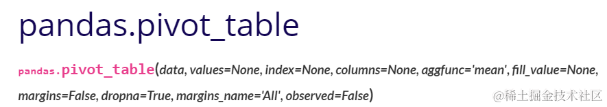 pandas.pivot_table(*data*, *values=None*, *index=None*, *columns=None*, *aggfunc='mean'*, *fill_value=None*, *margins=False*, *dropna=True*, *margins_name='All'*, *observed=False*)