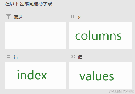 注意,在所有参数中,values、index、columns最为关键,它们分别对应excel透视表中的值、行、列: