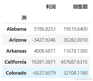 result1 = pd.pivot_table(data,index='洲' , values = ['销售额','利润'] , aggfunc = np.sum)