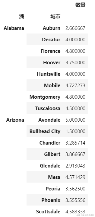 result2 = pd.pivot_table(data,index=['洲','城市'],aggfunc=np.mean,values=['数量'])