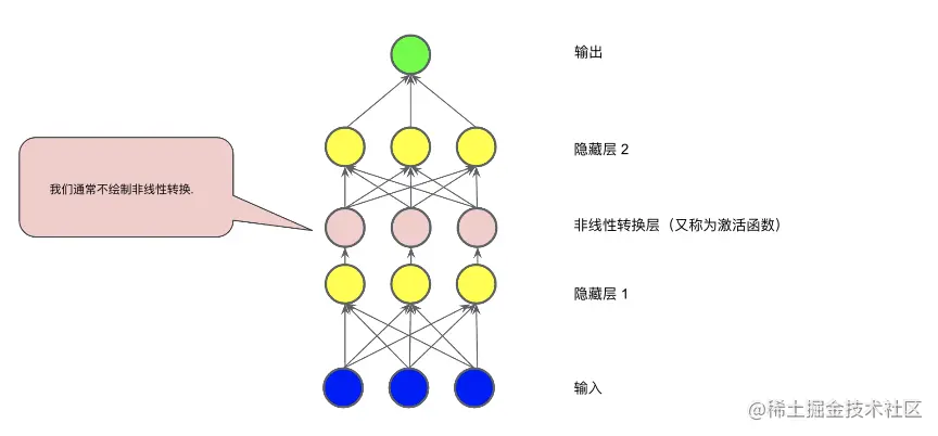 在下图所示的模型中,在隐藏层 1 中的各个节点的值传递到下一层进行加权求和之前,我们采用一个非线性函数对其进行了转换。这种非线性函数称为激活函数。