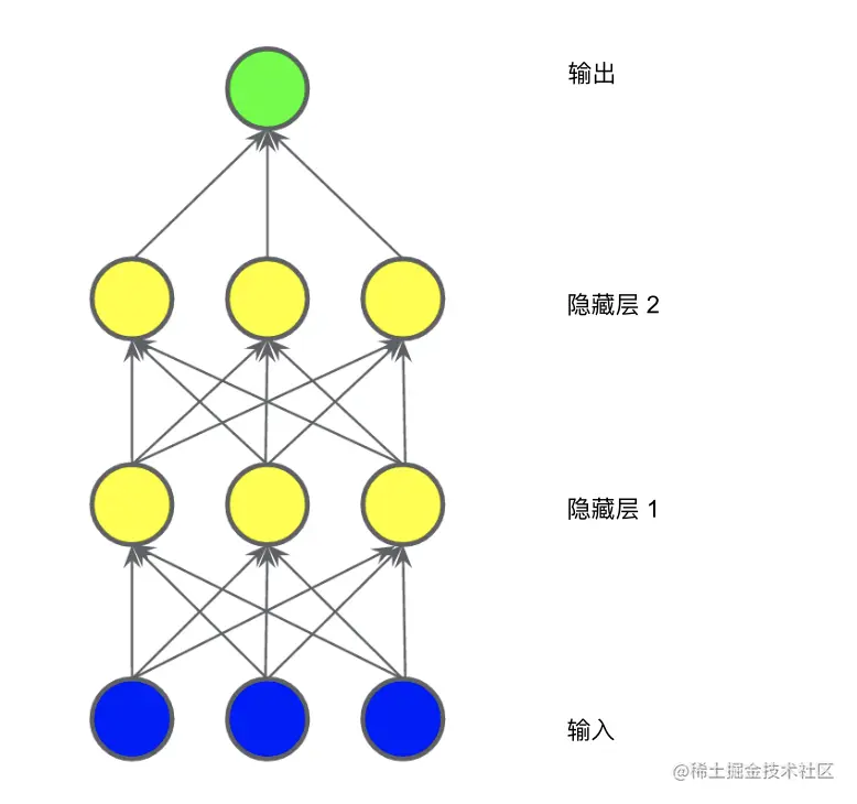 在下图所示的模型中,我们添加了一个表示中间值的“隐藏层”。隐藏层中的每个黄色节点均是蓝色输入节点值的加权和。输出是黄色节点的加权和。