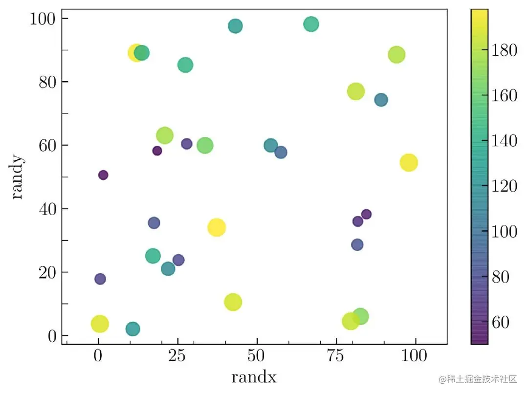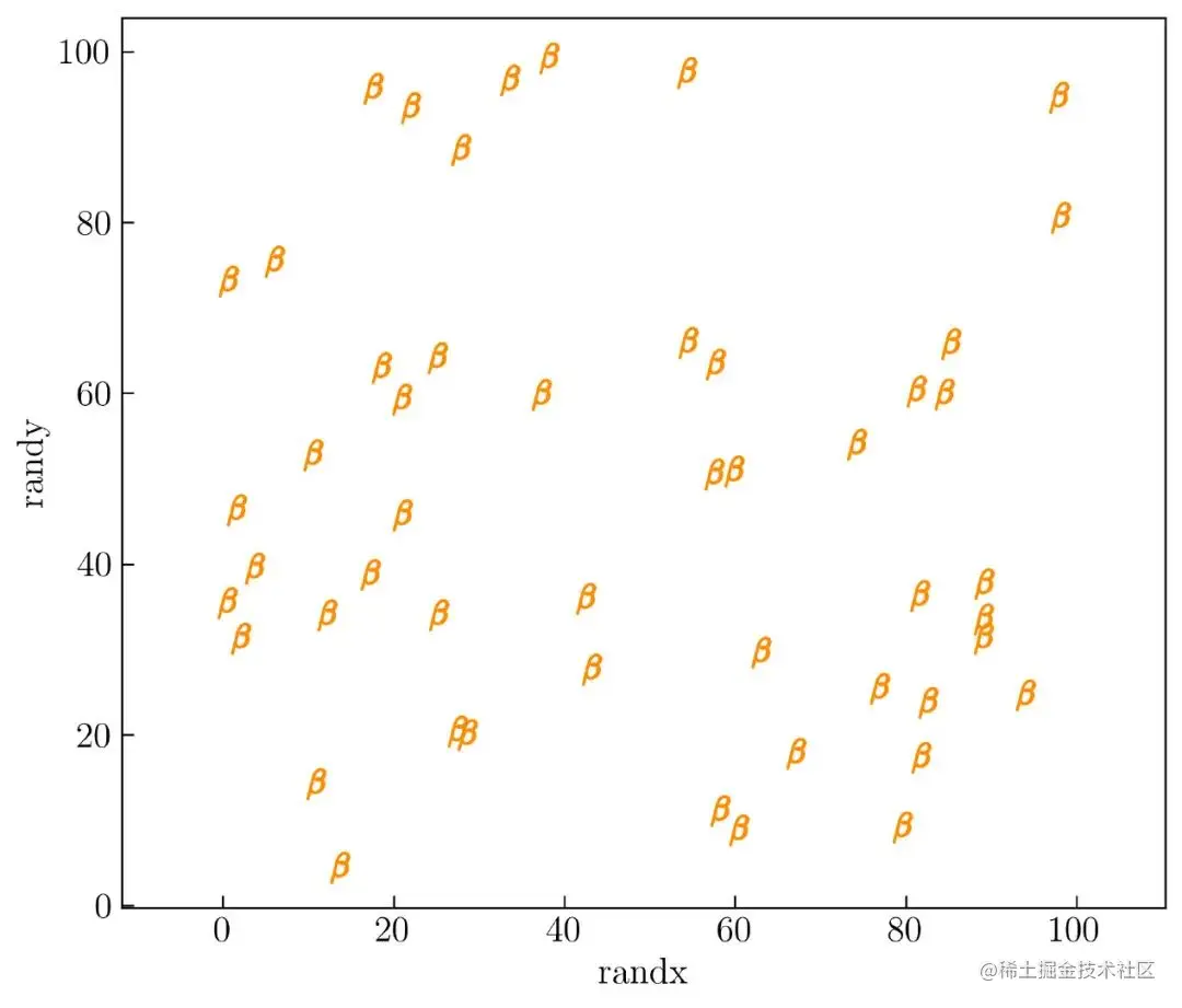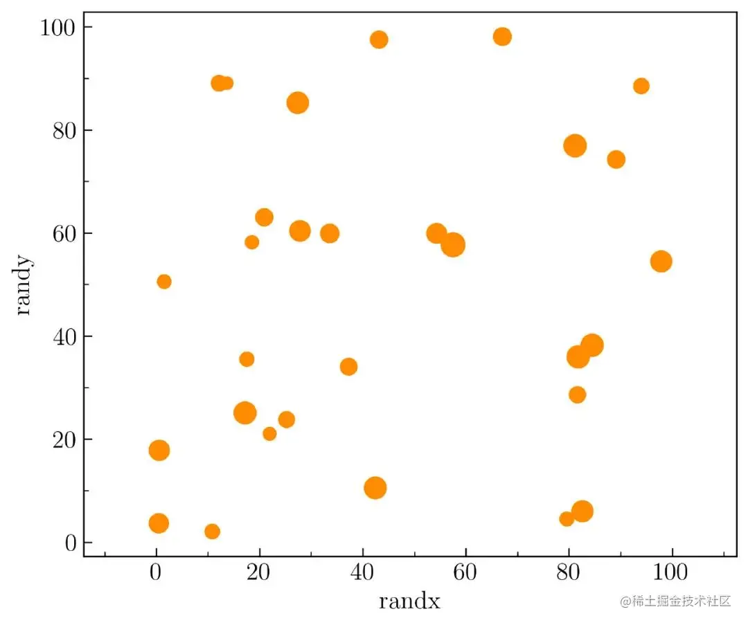 为了创建它,使用以下代码为变量 randx 和 randy 生成了一个随机数据,从 0 到 100