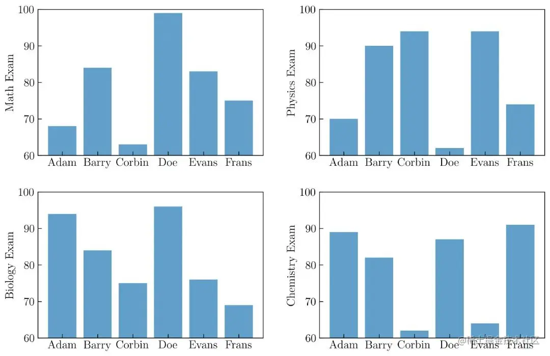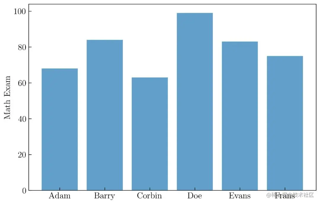如果想用条形图可视化数据,在 Matplotlib 中创建条形图之前,先创建要显示的模拟数据。比如在数学考试成绩中创建六个人的数据,要创建它,使用以下代码。