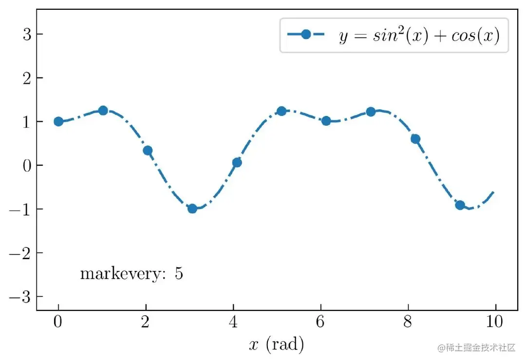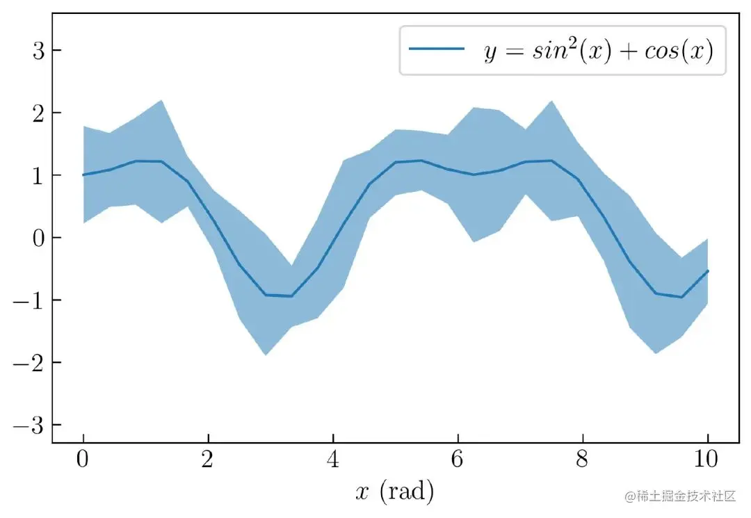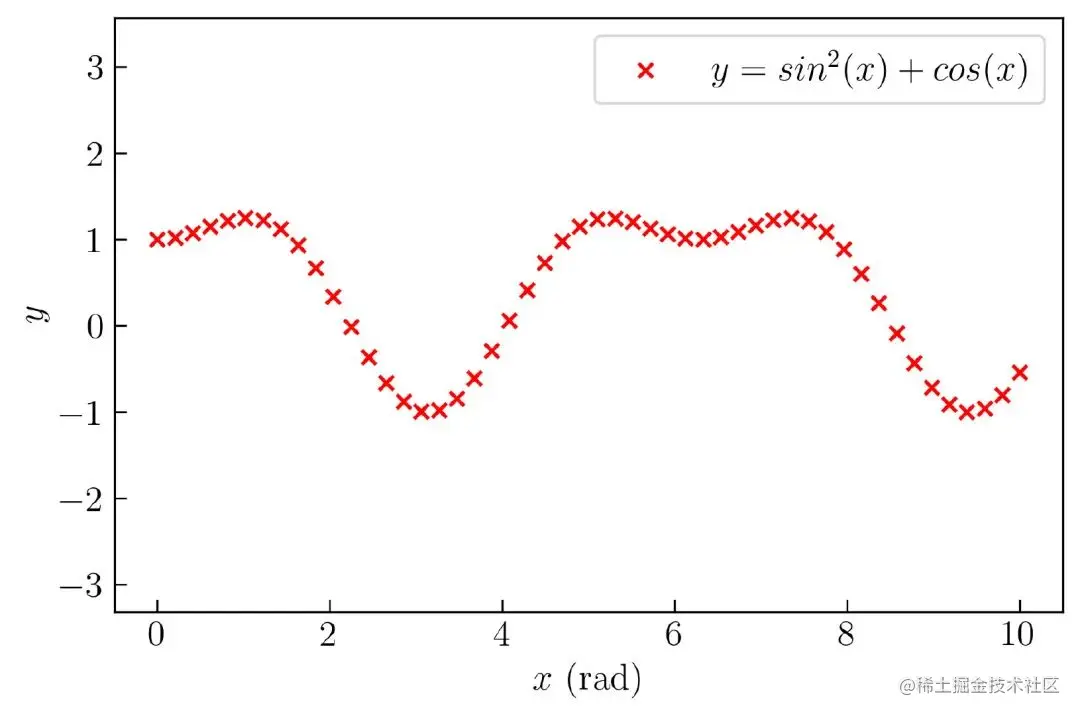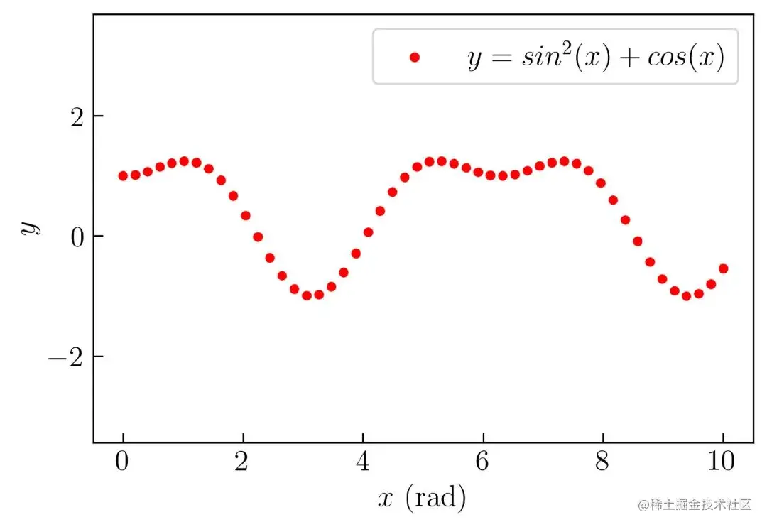 变量 x 是从 0 到 10 的 50 个数据的数组。变量 y 是 sin(x) 和 cos(x) 的平方之和。可以使用以下代码以散点图的形式可视化 x 轴上的变量 x 和 y 轴上的变量 y :