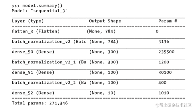 如你所见,每个BN层的每个输入添加了四个参数:γ,β,μ 和 σ(例如,第一个BN层添加了3136个参数,即4×784)。最后两个参数μ和σ是移动平均值。它们不受反向传播的影响,因此Keras称其为“不可训练”9(如果你计算BN参数的总数3,136+ 1,200 + 400,然后除以2,则得到2,368,即此模型中不可训练参数的总数)。