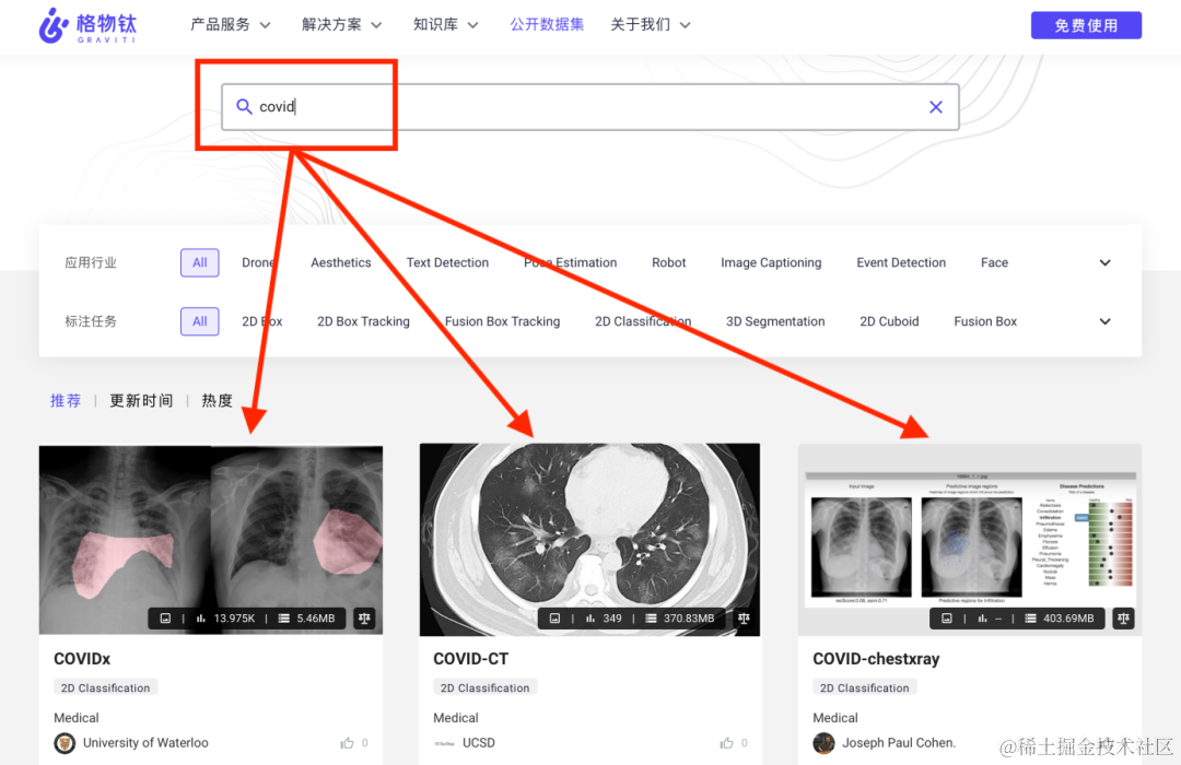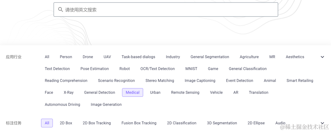 想找心仪数据集,现在一目了然。你不仅可以靠数据集的内容关键词搜索,还可以通过应用行业、标注类型等属性进行多维度查询。