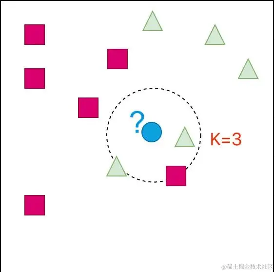 我们通过变化 K 的取值来进行判断。在该算法中K的取值一般是奇数,防止两个类别的个数相同,无法判断对象的类别