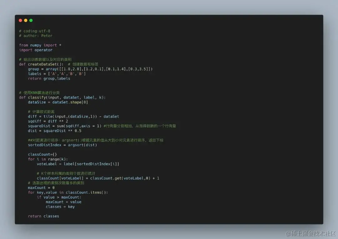下面通过一个简单的算法来实现 KNN 算法,主要步骤为: