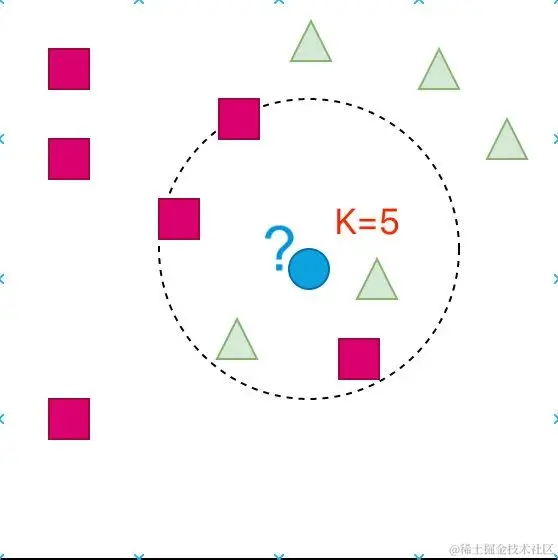 下面通过一组图形来解释下 KNN 算法的思想。我们的目的是:判断蓝色的点属于哪个类别