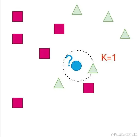 当 K 取值不同的时候,判别的结果是不同的。所以该算法中K值如何选择将非常重要,因为它会影响到我们最终的结果。