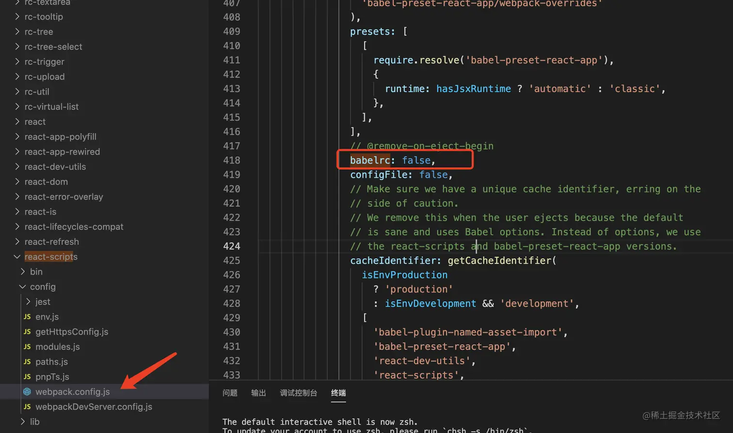 如下图,通过查看 create-react-app 脚手架源码得知,react-scripts 中的 webpack 禁用了修改 babel 配置的功能。