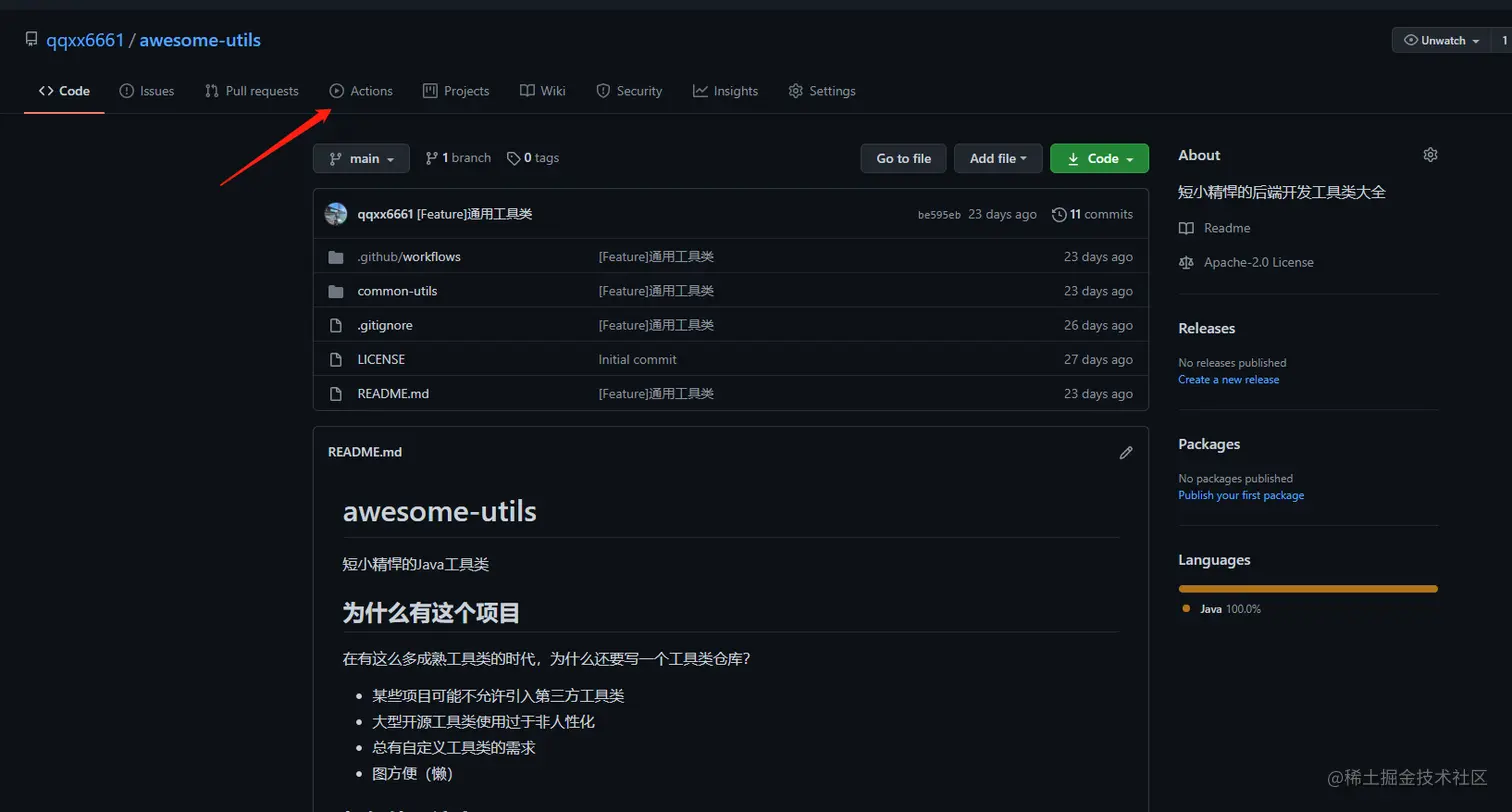 将代码commit并push后,点开你的仓库主页,点击Action标签: