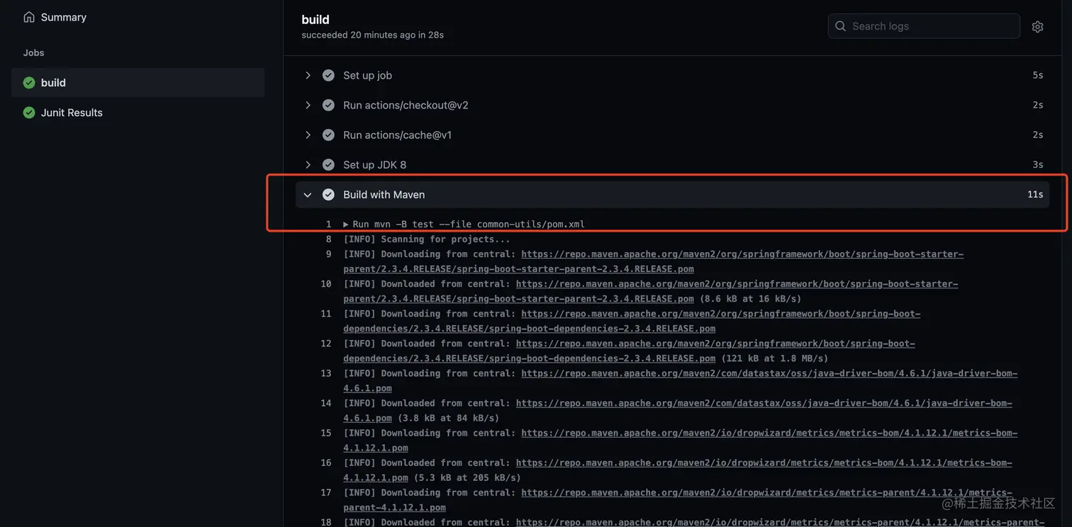 点开Maven的构建日志,可以看到我们第一次跑action,所有的依赖还是即时下载的: