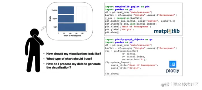 其次,需要创建可视化时,我们首先需要考虑的是所有的规格应当如何被可视化。 之后我们需要将这些规格的细节信息转换为代码。 上图显示了在两个流行的python库(Matplotlib和Plotly)中,仅仅是为了输出一个柱状图就需要大量的的代码。 这种情况同样会影响数据浏览,尤其是当用户对所要查找的内容只有模糊的概念时。