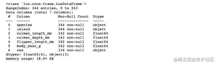 Palmer企鹅数据集目前已成为数据科学界的新宠,它是被过度使用的Iris数据集的直接替代品。 该数据集包含344个企鹅的数据。 数据由Kristen Gorman博士和南极洲Palmer Station站收集并提供。 首先让我们安装并导入Lux库。你可以通过Binder在Jupyter notbook中继续阅读本教程。