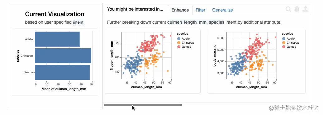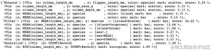 除了基本的推荐功能外,我们还可以指定分析意图。 比方说,我们想找出嘴峰长度随企鹅物种变化的模式。 我们可以在此处将意图设置为['culmen_length_mm','species']。再次打印数据框时,就可以看到推荐已经编程与我们指定的意图相关的内容。
