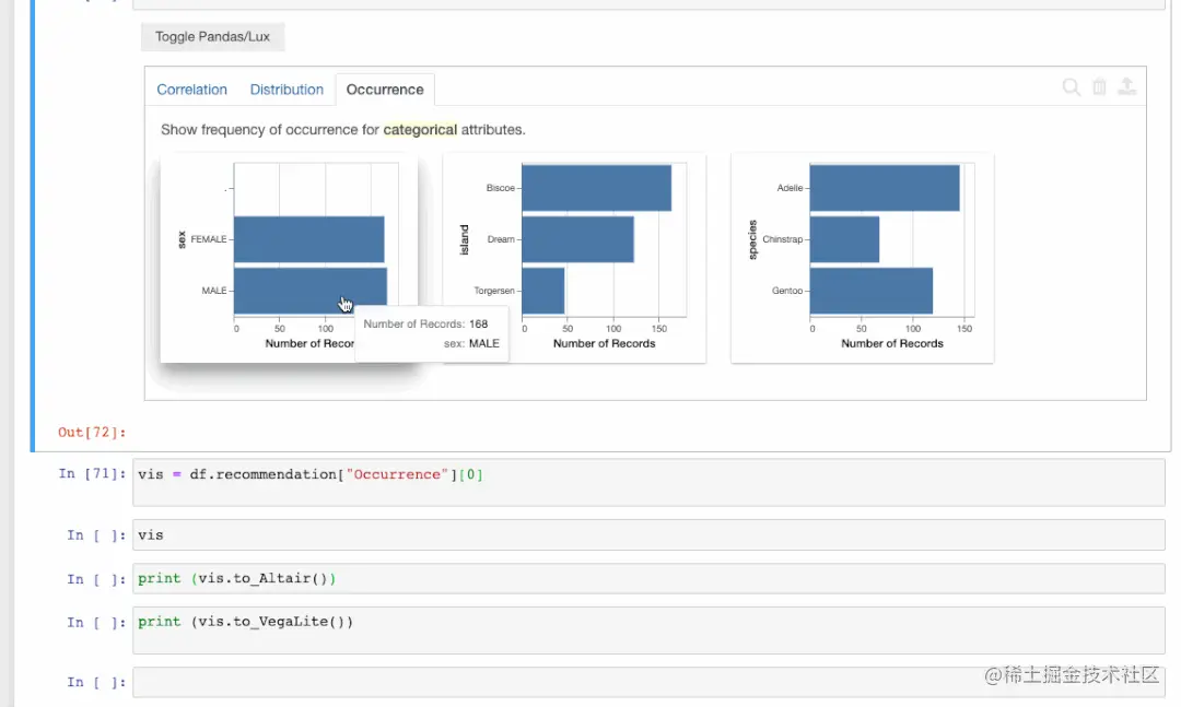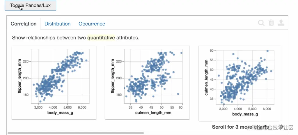 当dataframe被打印出来时,我们看到的是Pandas默认的表格格式。我们可以点击切换来获得由Lux自动生成的一组可视化建议。