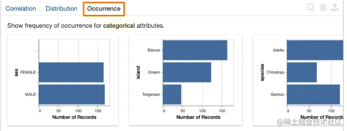 出现率选项卡: 显示了一组从数据集中生成的条形图。