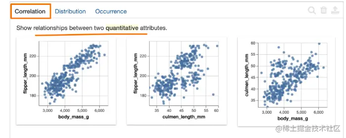 相关性选项卡: 显示定量属性之间的成对关系,按最高相关至最低相关排序。