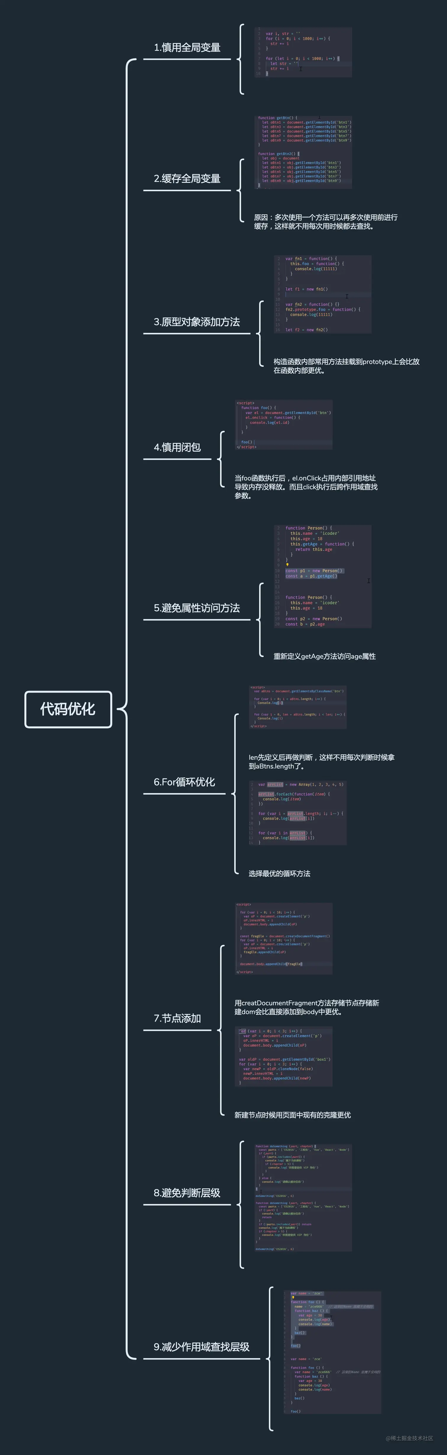 javascript代码优化 白木_ 2021-02-20 205 阅读1分钟 代码优化常见的几个优化点如下图(以下图代码是根据jsbench验证过): 总结 以上是个人总结出的代码优化点,代码是根据jsbench验证过。