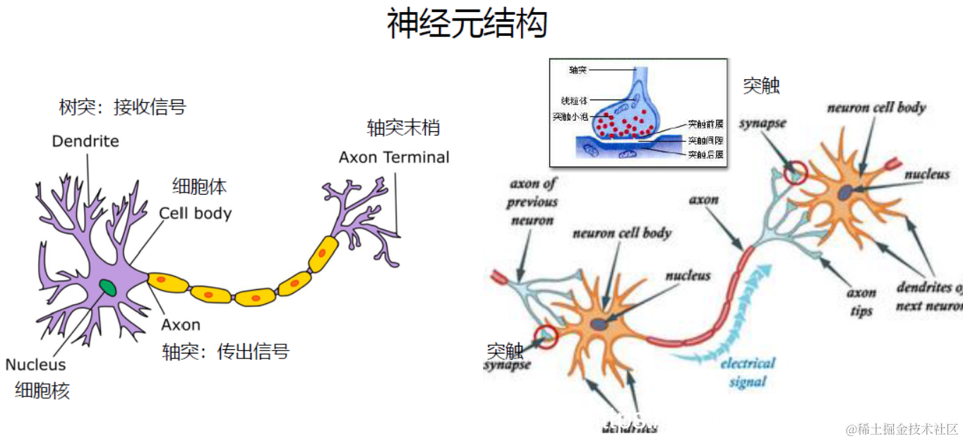 生物神经元包括细胞体和突起两个部分,突起又包括树突(接收信号)和轴突(传出信号)。