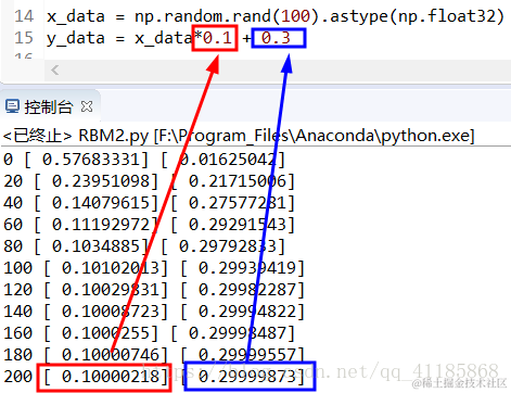 TF:Tensorflow之一次函数应用,随机生成100个数,利用Tensorflow训练使其逼近已知一次函数的斜率和截距