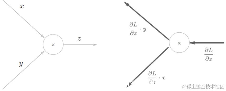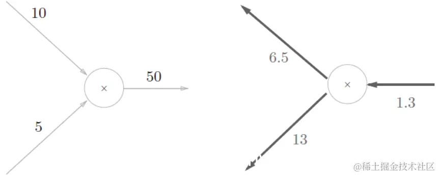 (2)、乘法的反向传播:左图是正向传播,右图是反向传播。