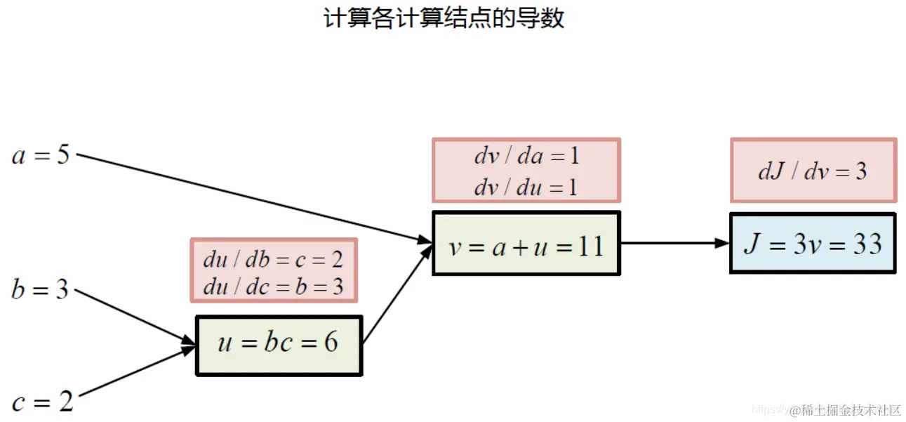 | 前向计算过程: 计算各计算结点的导数。 |