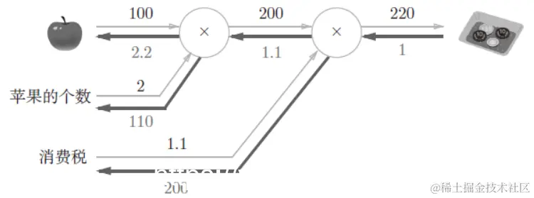 (3)、购买苹果的反向传播的例子:这个问题相当于求“支付金额关于苹果的价格的导数”“支付金额关于苹果的个数的导数”“支付金额关于消费税的导数”。