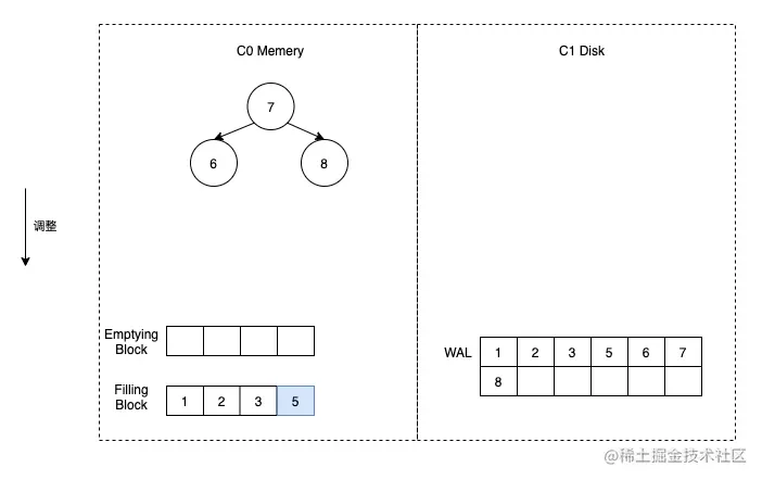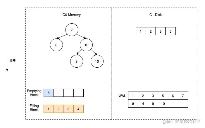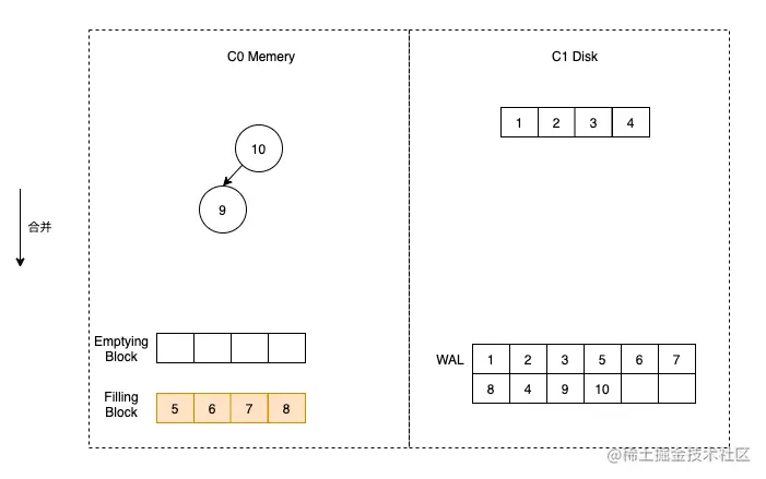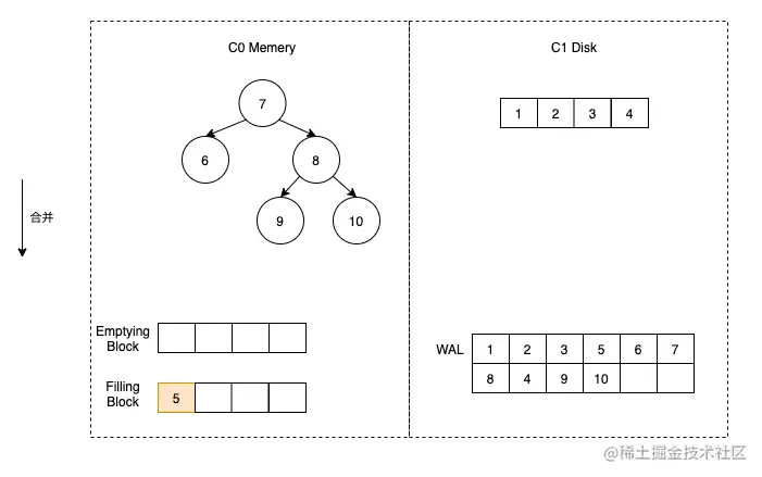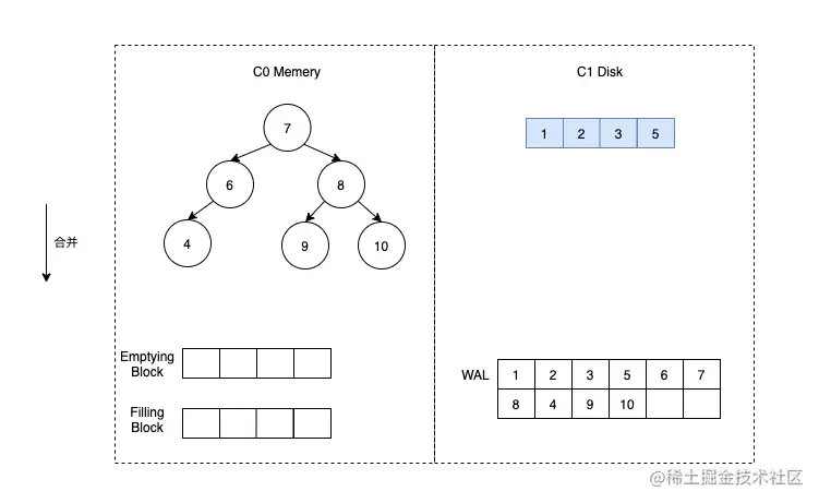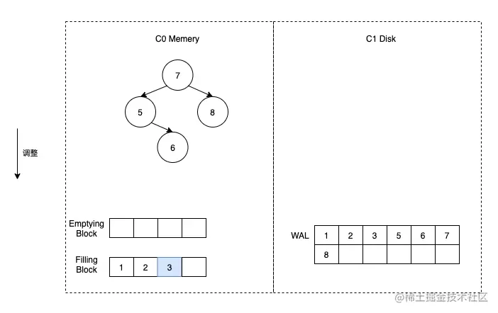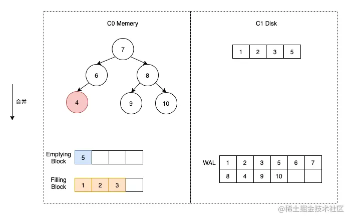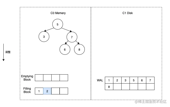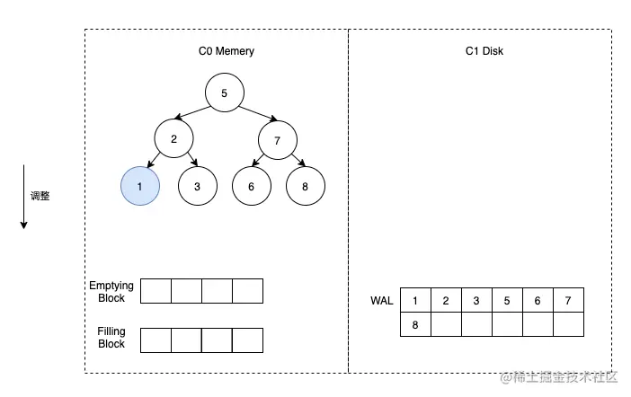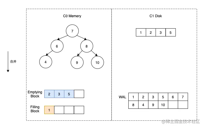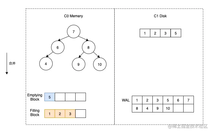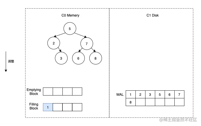 这时假定触发了合并,那么我们首先将 C1 的数据加载到 Emptying Block 中,但是由于 C1 没有数据,所以 Emptying Block 数据为空。直接将 C0 中的数据按顺序放到 Filling Block 中即可。
