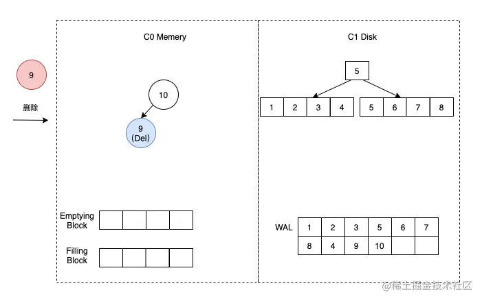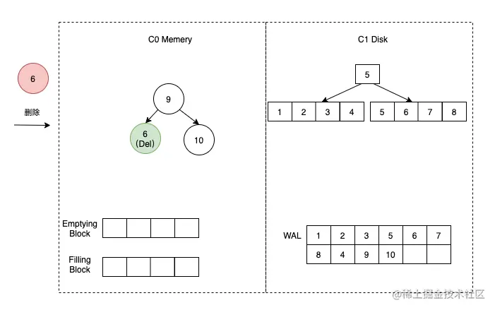 删除数据时,LSM 树将节点标记为「已删除」状态,而不直接删除。等到下次合并操作时,才将数据真正删除。