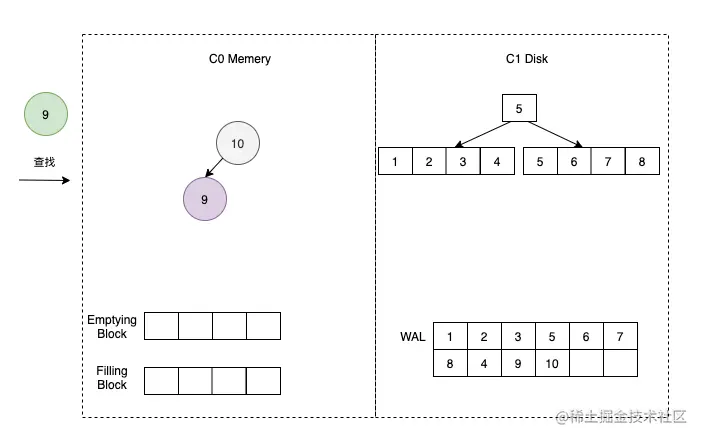在实际的应用中,内存中会有很多 MemTable ,而磁盘中也会有很多 SSTable,我们假设内存中只有一个 MemTable,称之为 C0,磁盘中也只有一个 SSTable ,称之为 C1。
