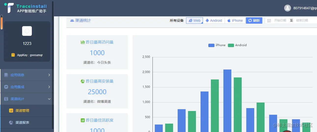由于安卓打渠道包不适用于多个渠道的大规模推广,iOS 使用 itunes 的渠道链接也存在延时性等问题,我个人喜欢用嵌入第三方sdkTraceinstall使用比较简洁、开发快,能够自动识别渠道且存储各渠道的精准用户量解决业务上的需求