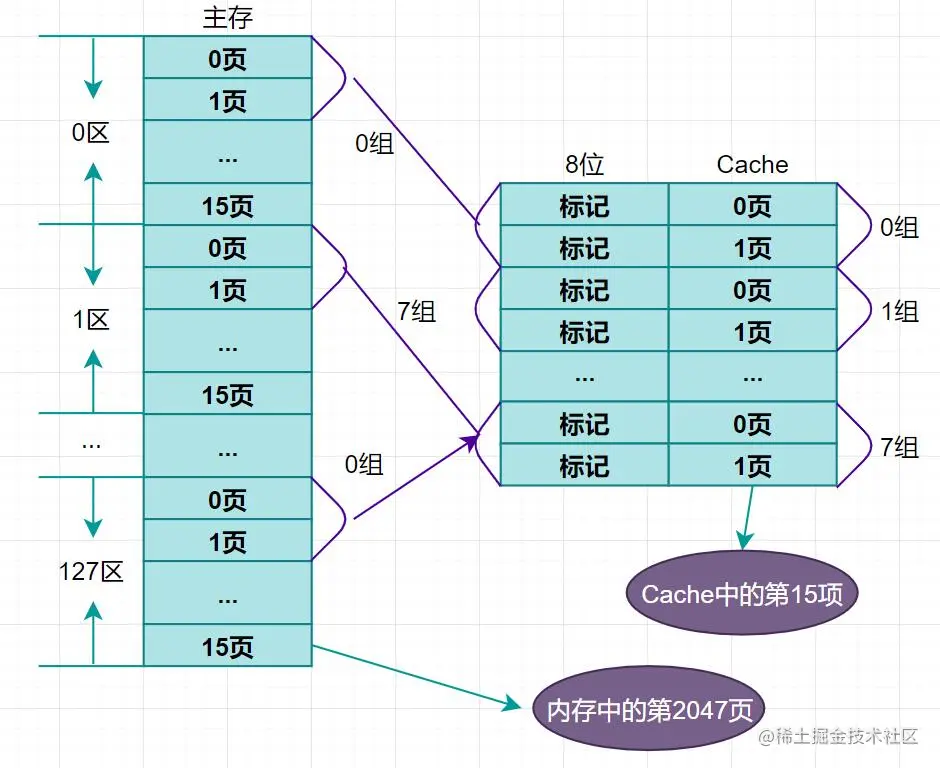 所谓直接相联映像是指Cache中的0页只能存储主存中0页的内容,这里主存中0页指的是每个区的0页,比如上图中的0区的0页,1区的16页,127区的2032页等。