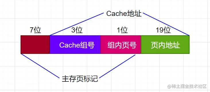 此时,在组相连映像中,Cache组号使用3位表示,组内页号使用1位表示,页内地址使用19位表示。其中,3位的Cache组号,1位的组内页号和前面的7位构成了主存页标记;3位的Cache组号,1位的组内页号和19号的页内地址构成了Cache地址。