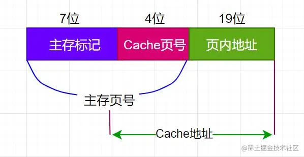 如上图所示,主存标记为7位,Cache页号为4位,页内地址为19位。