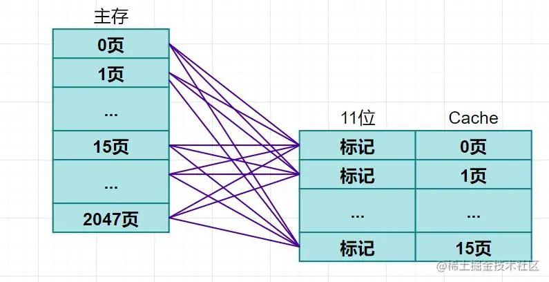 从图中可以看出,Cache中的任何一个也,都可以存储主存中的任何一个页。