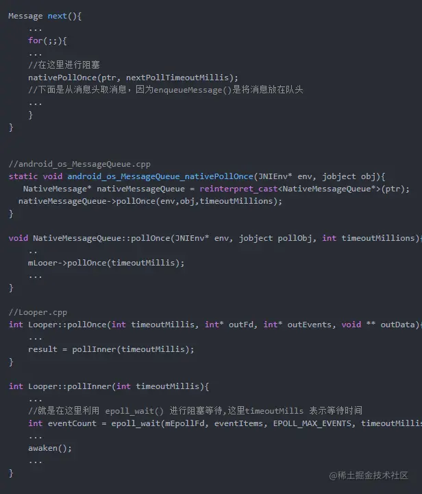 - 1:通电(Looper.loop()),block(nativePollOnce()).