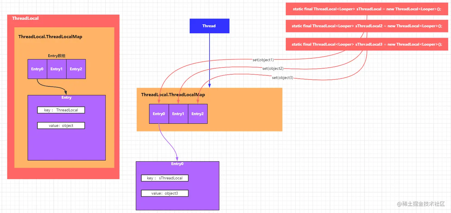 一个Thread对应一个ThreadLocal.ThreadLocalMap存储 ThreadLocal数据. 一个Thread对应多个ThreadLocal。一个ThreadLocal只能存储一个数据。