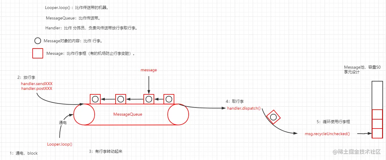 - Looper.loop() :比作传送带的机器(动力来源)。