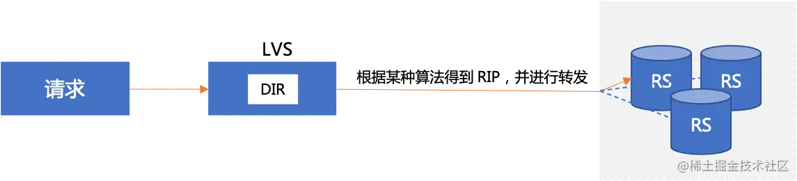 LVS 通过某种负载均衡算法得到 RIP,然后通过改写请求体和响应体的目的 IP 和源 IP 来达到让客户端和 RS 通信的目的。