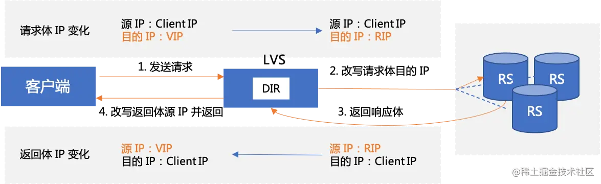 LVS 通过某种负载均衡算法得到 RIP,然后通过二次封装请求体,并将新请求体转发到 RS 中。将 RS 对新请求体解包后,会继续解请求体,发现 目的 IP 为网卡绑定的 VIP。因此 RS 处理完成后,返回体直接走 RS 的公网出口回客户端,并且源 IP 仍然为 VIP。