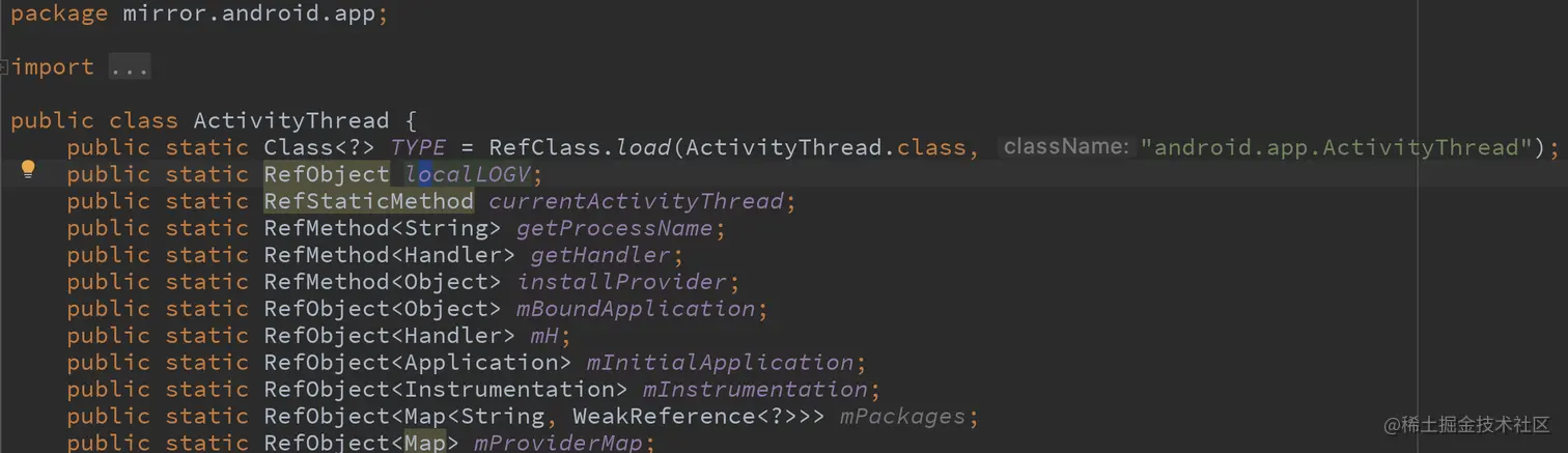- 在复刻的核心服务中,有些也需要去调用真正核心服务的能力。因此VA中还实现了Framework层一些类的镜像类。只是这些镜像类只是保存了通过反射去获取对于类的方法和变量。这样VA可以主动去调用。RefXXX是包装类,比如RefObject封装了Field,RefMethod封装了Method。到时可以直接用于反射调用。下图的ActivityThread就是系统的ActivityThread的镜像