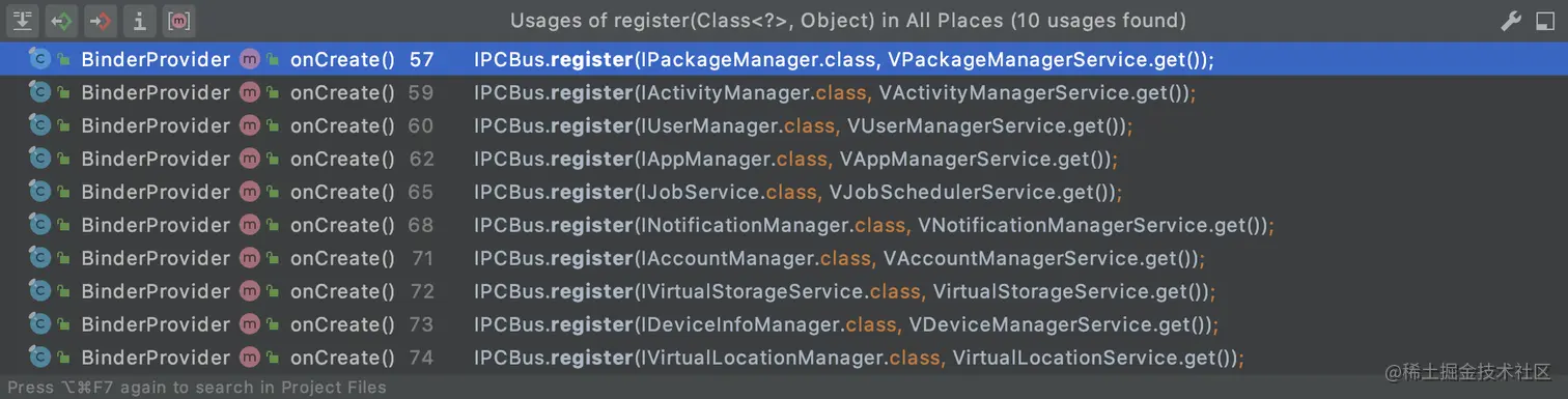 - VA主进程通过ContentProvider的call()获取传递的Bundle其中的Binder引用。这个Binder引用可以和VA服务进程通信,提供了getService(String)的接口,从而获取对应的复刻核心服务的Binder引用。就能调用这些复刻核心服务提供的能力。