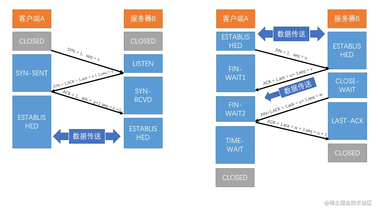 假设现在存在客户端A,服务器B,两者都处于CLOSED状态,则建立AB之间建立TCP连接的步骤如下: