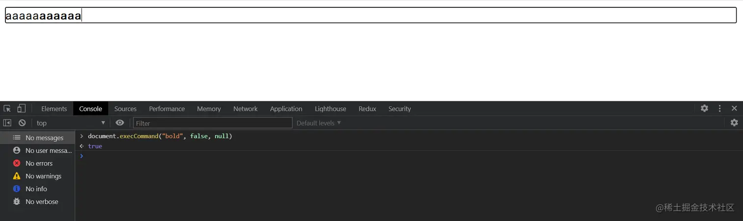 然后我们在控制台执行document.execCommand("bold", false, null), 将选中部分字体加粗